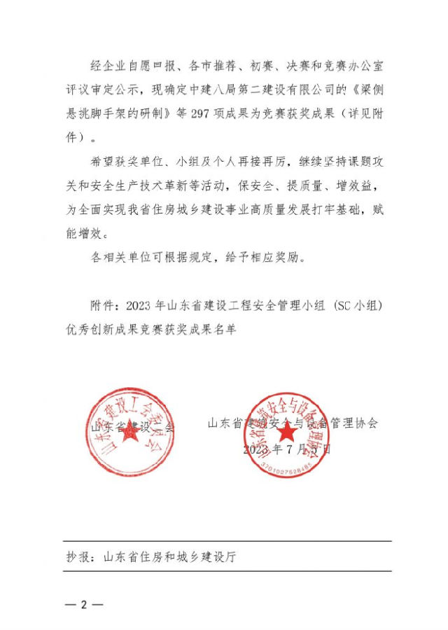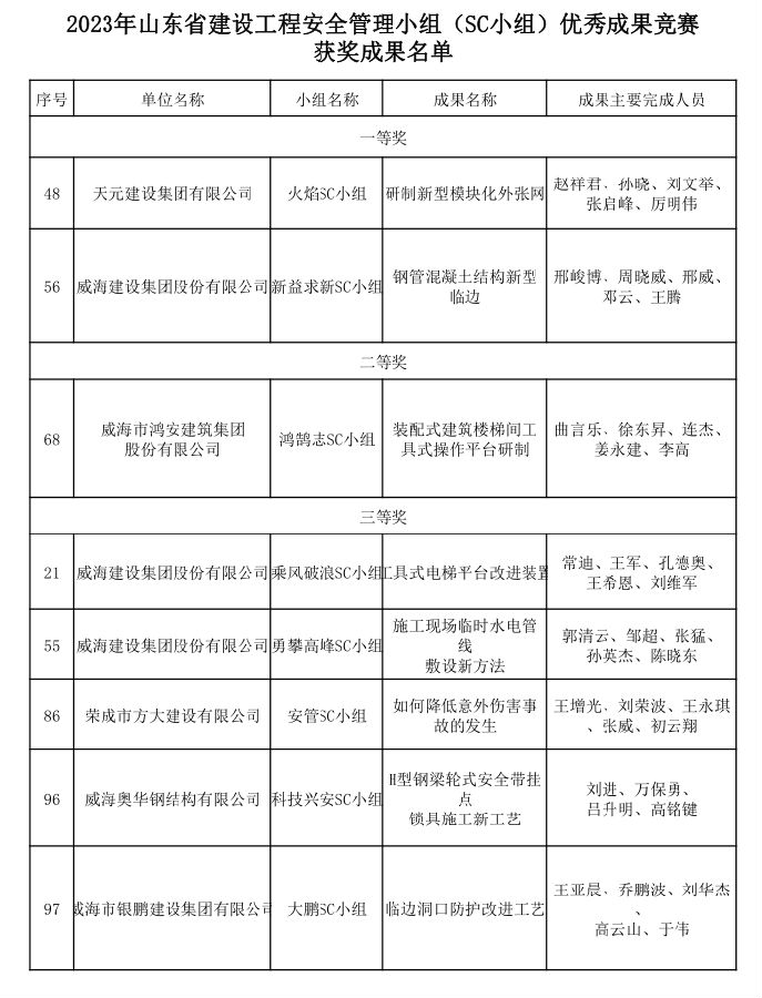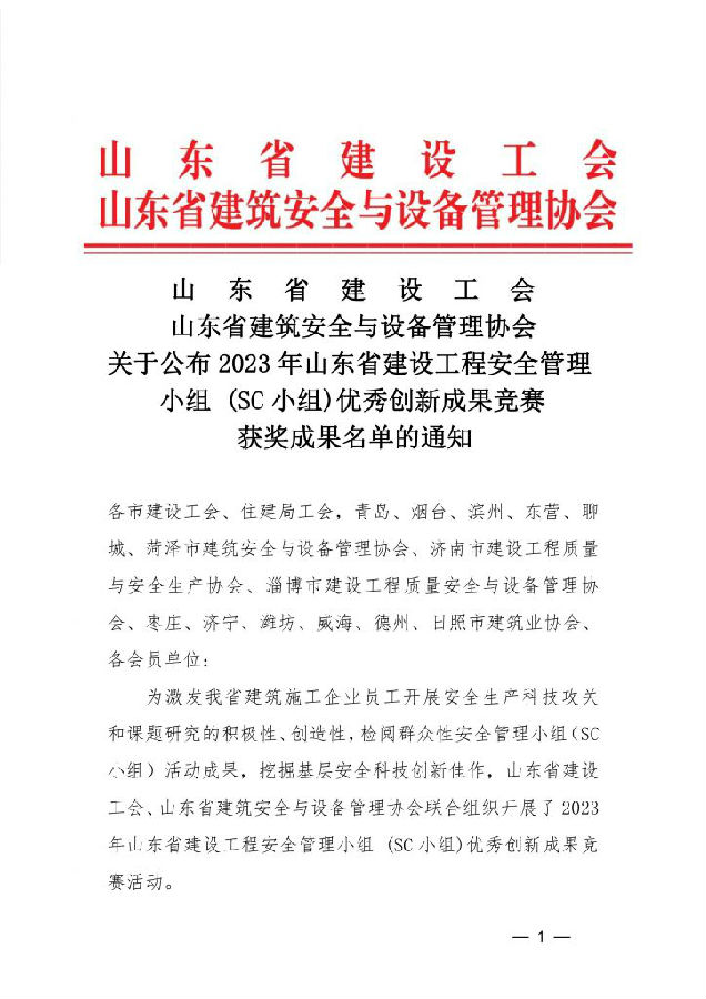近日,山東省建筑安全與設(shè)備管理協(xié)會(huì)下發(fā)《關(guān)于公布2023年山東省建設(shè)工程安全管理小組(SC小組)優(yōu)秀創(chuàng)新成果競賽獲獎(jiǎng)成果名單的通知》,我市共8項(xiàng)成果獲得2023年山東省建設(shè)工程安全管理小組(SC小組)優(yōu)秀創(chuàng)新成果,其中,一等獎(jiǎng)2項(xiàng),二等獎(jiǎng)1項(xiàng),三等獎(jiǎng)5項(xiàng)。