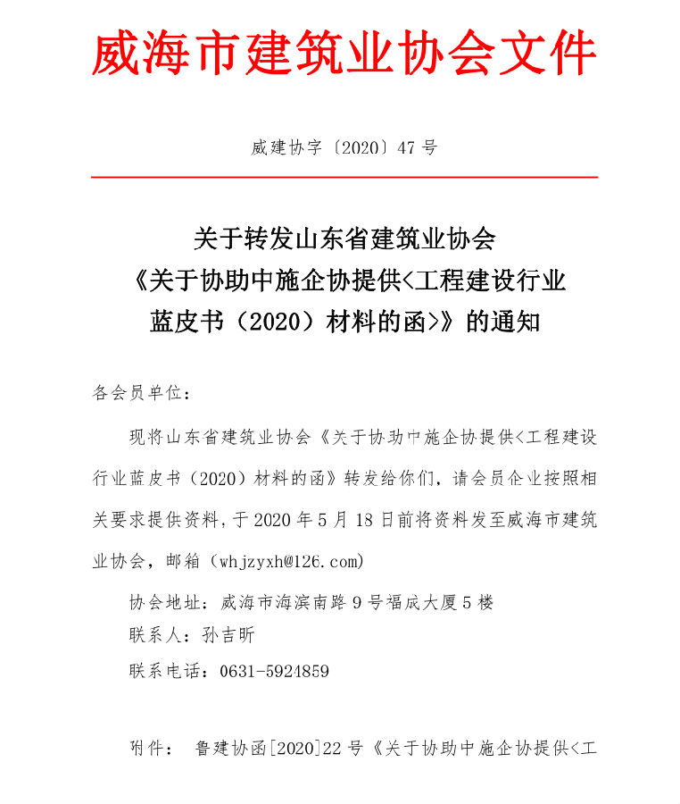 關(guān)于轉(zhuǎn)發(fā)山東省建筑業(yè)協(xié)會(huì) 《關(guān)于協(xié)助中施企協(xié)提供<工程建設(shè)行業(yè) 藍(lán)皮書(shū)(2020)材料的函>》的通知