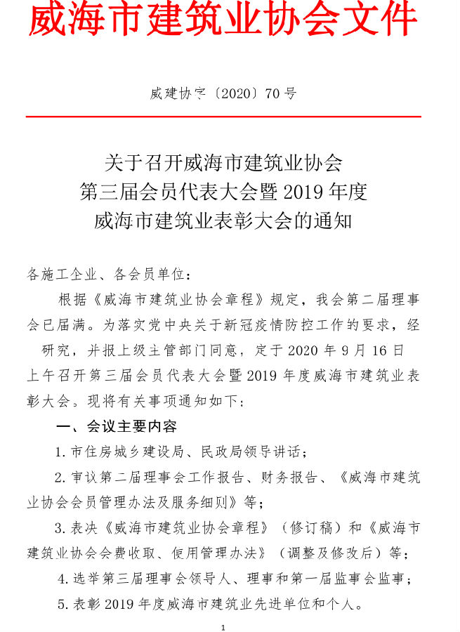 關(guān)于召開威海市建筑業(yè)協(xié)會(huì)第三屆會(huì)員代表大會(huì)暨2019年度威海市建筑業(yè)表彰大會(huì)的通知