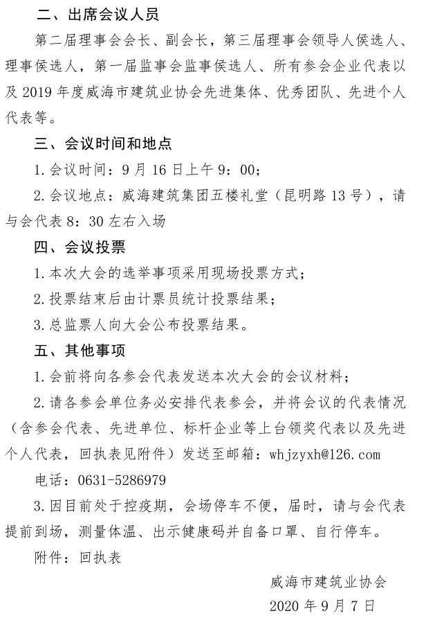 >關(guān)于召開威海市建筑業(yè)協(xié)會(huì)第三屆會(huì)員代表大會(huì)暨2019年度威海市建筑業(yè)表彰大會(huì)的通知