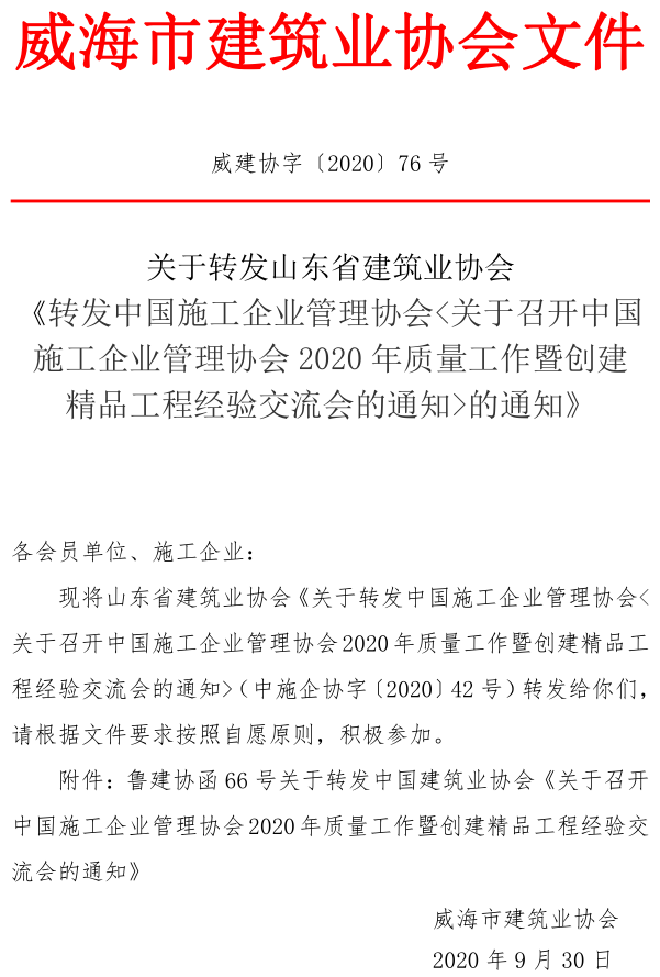 • 當(dāng)前位置:首頁 >文件公告>關(guān)于轉(zhuǎn)發(fā)山東省建筑業(yè)協(xié)會 《轉(zhuǎn)發(fā)中國施工企業(yè)管理協(xié)會<關(guān)于召開中國施工企業(yè)管理協(xié)會2020年質(zhì)量工作暨創(chuàng)建精品工程經(jīng)驗(yàn)交流會的通知>的通知》