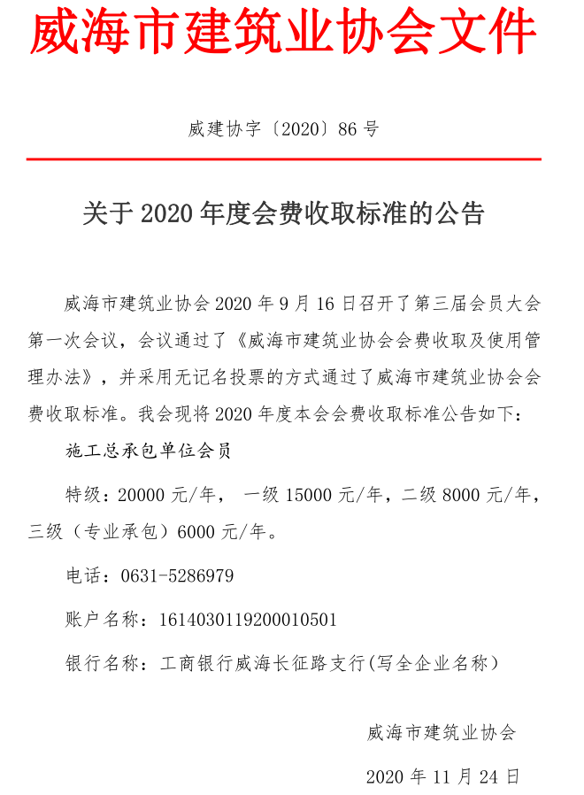 關(guān)于2020年度會費收取標(biāo)準(zhǔn)的公告