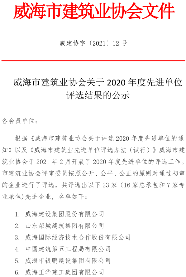 威海市建筑業(yè)協(xié)會關于2020年度先進單位評選結果的公示