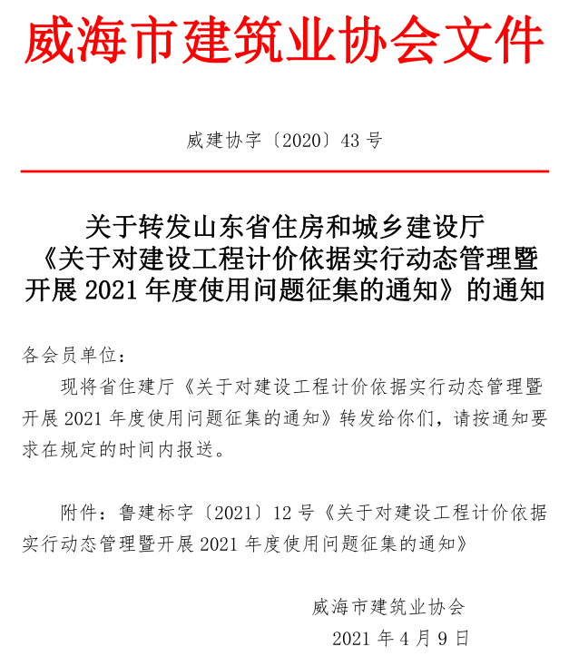 關(guān)于轉(zhuǎn)發(fā)山東省住房和城鄉(xiāng)建設(shè)廳 《關(guān)于對(duì)建設(shè)工程計(jì)價(jià)依據(jù)實(shí)行動(dòng)態(tài)管理暨開(kāi)展2021年度使用問(wèn)題征集的通知》的通知