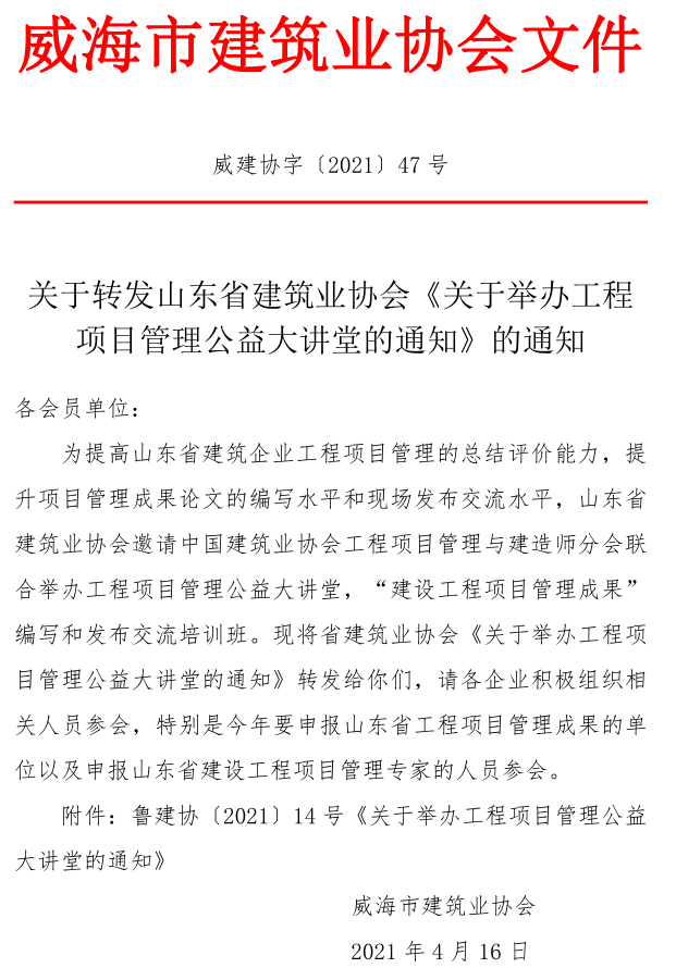 >關(guān)于轉(zhuǎn)發(fā)山東省建筑業(yè)協(xié)會(huì)《關(guān)于舉辦工程 項(xiàng)目管理公益大講堂的通知》的通知