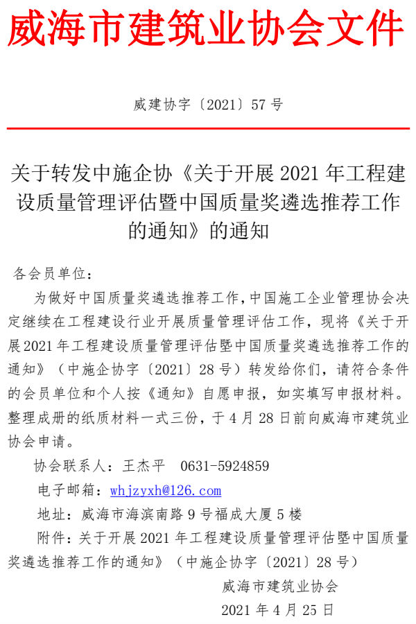 • 當(dāng)前位置:首頁(yè) >文件公告>? 關(guān)于轉(zhuǎn)發(fā)中施企協(xié)《關(guān)于開(kāi)展2021年工程建設(shè)質(zhì)量管理評(píng)估暨中國(guó)質(zhì)量獎(jiǎng)遴選推薦工作的通知》的通知