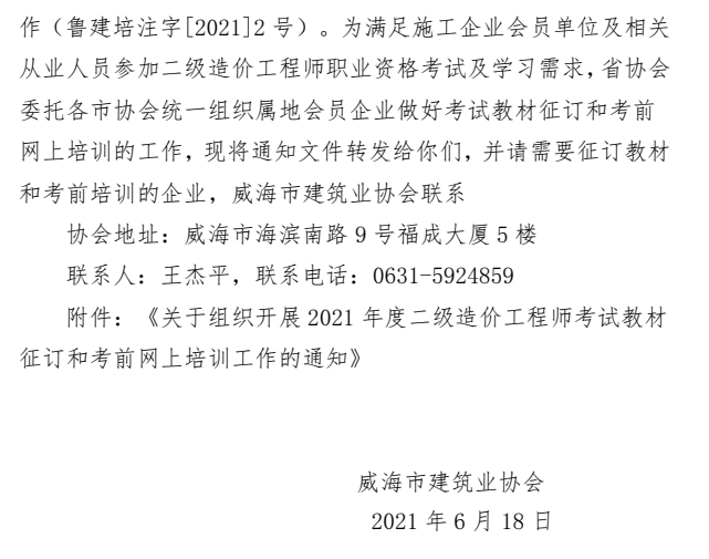 • 當(dāng)前位置:首頁(yè) >文件公告>關(guān)于轉(zhuǎn)發(fā)省建協(xié)《關(guān)于組織開(kāi)展2021年度 二級(jí)造價(jià)工程師考試教材征訂和考前 網(wǎng)上培訓(xùn)工作的通知》的通知