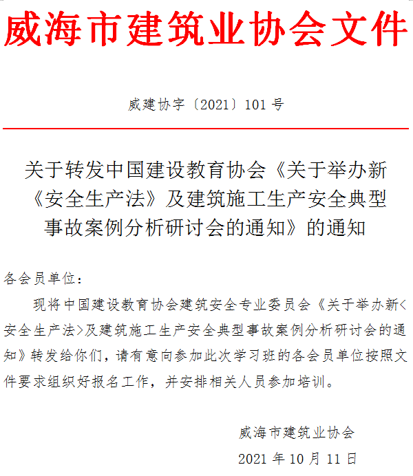 關(guān)于轉(zhuǎn)發(fā)中國建設(shè)教育協(xié)會(huì)《關(guān)于舉辦新 《安全生產(chǎn)法》及建筑施工生產(chǎn)安全典型 事故案例分析研討會(huì)的通知》的通知