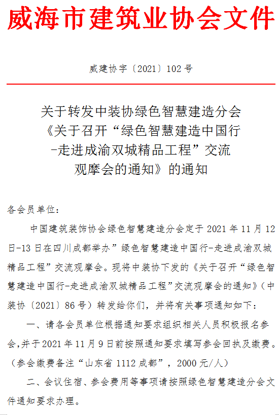 關(guān)于轉(zhuǎn)發(fā)中裝協(xié)綠色智慧建造分會(huì)《關(guān)于召開“綠色智慧建造中國(guó)行-走進(jìn)成渝雙城精品工程”交流觀摩會(huì)的通知》的通知