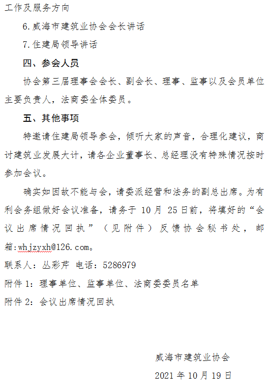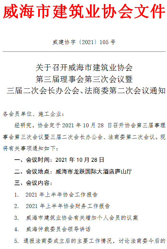 關(guān)于召開威海市建筑業(yè)協(xié)會(huì)第三屆理事會(huì)第三次會(huì)議暨?三屆二次會(huì)長(zhǎng)辦公會(huì)、法商委第二次會(huì)議通知