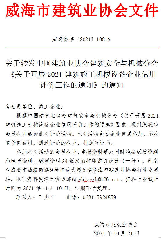 關(guān)于轉(zhuǎn)發(fā)中國(guó)建筑業(yè)協(xié)會(huì)建筑安全與機(jī)械分會(huì)《關(guān)于開展2021建筑施工機(jī)械設(shè)備企業(yè)信用評(píng)價(jià)工作的通知》的通知