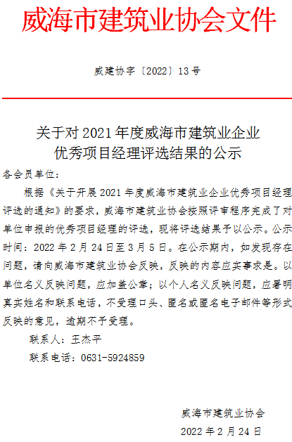 >關(guān)于對2021年度威海市建筑業(yè)企業(yè)優(yōu)秀項目經(jīng)理評選結(jié)果的公示