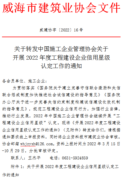 >關于轉(zhuǎn)發(fā)中國施工企業(yè)管理協(xié)會關于開展2022年度工程建設企業(yè)信用星級認定工作的通知