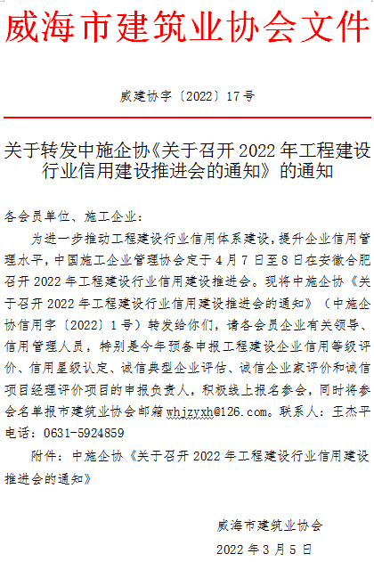 >關于轉發(fā)中施企協(xié)《關于召開2022年工程建設行業(yè)信用建設推進會的通知》的通知