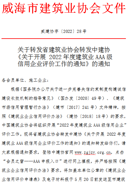 關(guān)于轉(zhuǎn)發(fā)省建筑業(yè)協(xié)會轉(zhuǎn)發(fā)中建協(xié)《關(guān)于開展 2022年度建筑業(yè)AAA級信用企業(yè)評價工作的通知》的通知
