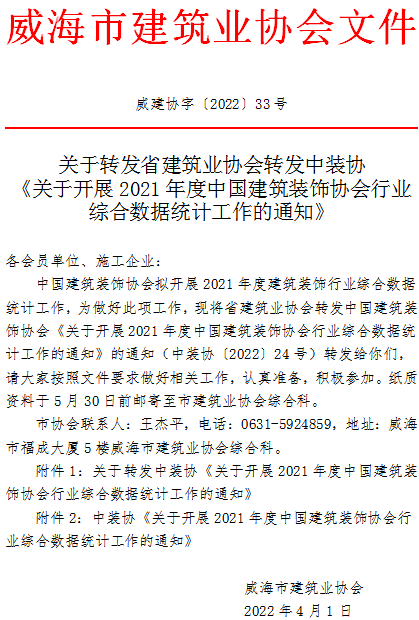關(guān)于轉(zhuǎn)發(fā)省建筑業(yè)協(xié)會轉(zhuǎn)發(fā)中裝協(xié)《關(guān)于開展2021年度中國建筑裝飾協(xié)會行業(yè)綜合數(shù)據(jù)統(tǒng)計工作的通知》