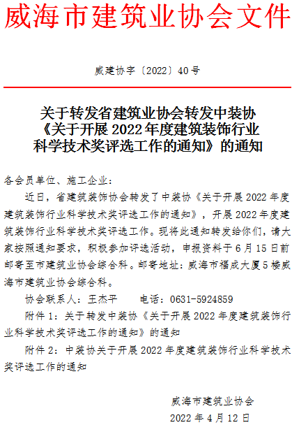 關(guān)于轉(zhuǎn)發(fā)省建筑業(yè)協(xié)會(huì)轉(zhuǎn)發(fā)中裝協(xié)《關(guān)于開(kāi)展2022年度建筑裝飾行業(yè)科學(xué)技術(shù)獎(jiǎng)評(píng)選工作的通知》的通知