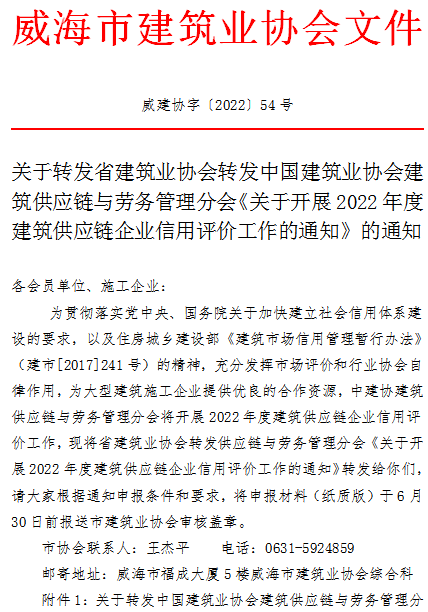 附件1:關(guān)于轉(zhuǎn)發(fā)中國建筑業(yè)協(xié)會建筑供應鏈與勞務管理分會《關(guān)于開展2022年度建筑供應鏈企業(yè)信用評價工作的通知》的通知.pdf