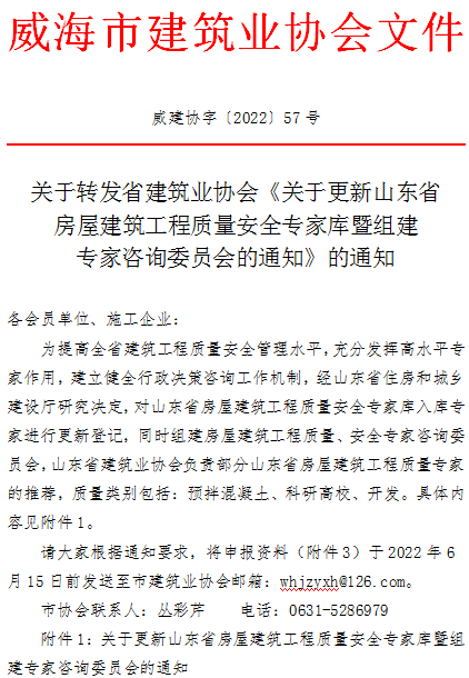 關(guān)于轉(zhuǎn)發(fā)省建筑業(yè)協(xié)會(huì)《關(guān)于更新山東省房屋建筑工程質(zhì)量安全專(zhuān)家?guī)祠呓M建專(zhuān)家咨詢(xún)委員會(huì)的通知》的通知