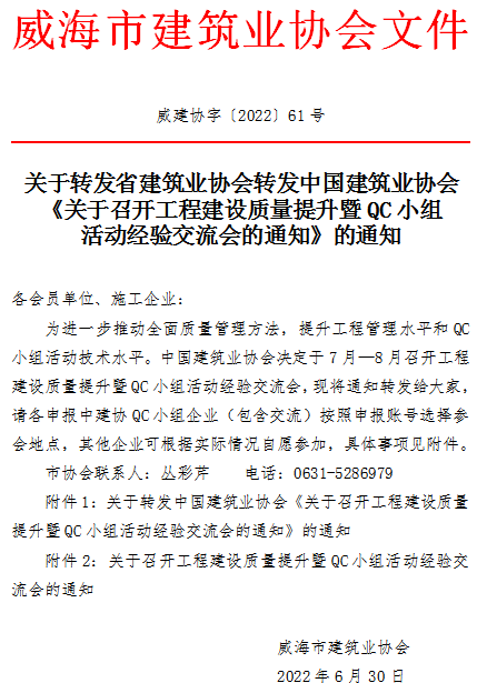 轉(zhuǎn)發(fā)省建筑業(yè)協(xié)會(huì)轉(zhuǎn)發(fā)中國(guó)建筑業(yè)協(xié)會(huì)《關(guān)于召開(kāi)工程建設(shè)質(zhì)量提升暨QC小組活動(dòng)經(jīng)驗(yàn)交流會(huì)的通知》的通知