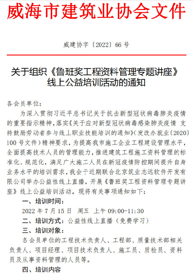 關于組織《魯班獎工程資料管理專題講座》 線上公益培訓活動的通知