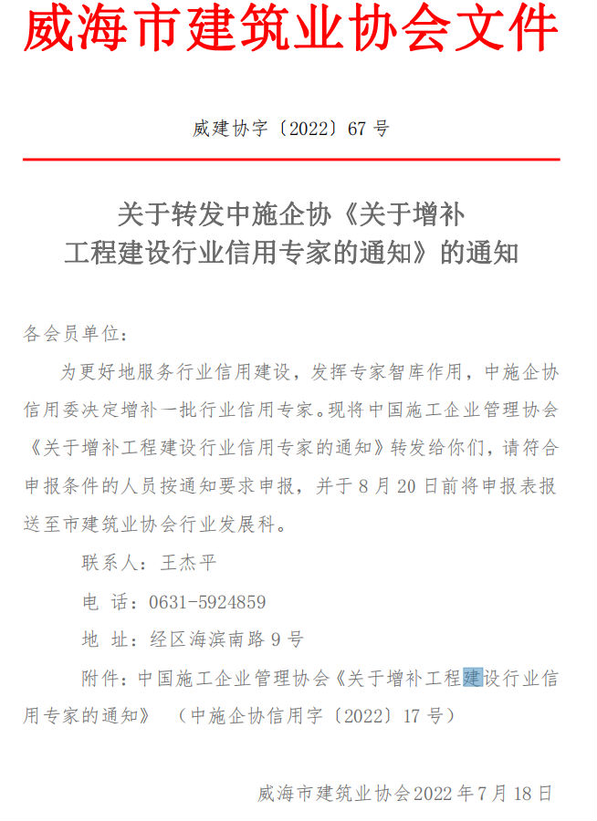 >2022第67號關于轉發(fā)中施企協(xié)《關于增補 工程建設行業(yè)信用專家的通知》的通知