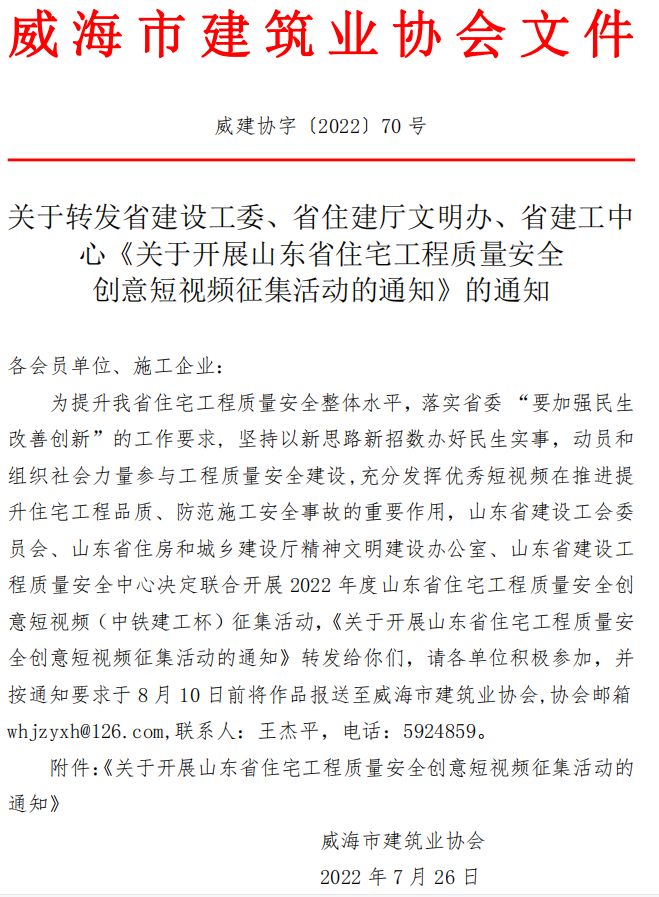 關(guān)于轉(zhuǎn)發(fā)省建設(shè)工委、省住建廳文明辦、省建工中心《關(guān)于開展山東省住宅工程質(zhì)量安全 創(chuàng)意短視頻征集活動的通知》的通知