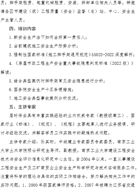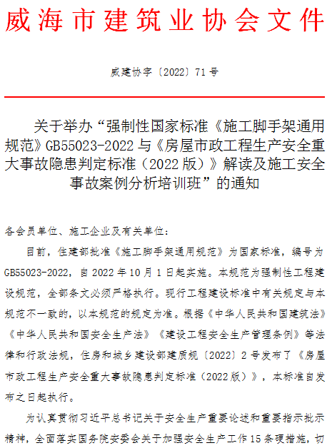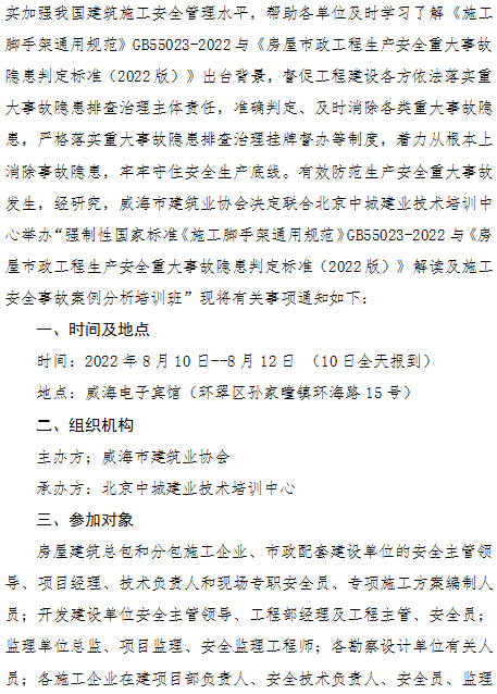 關(guān)于舉辦“強(qiáng)制性國家標(biāo)準(zhǔn)《施工腳手架通用規(guī)范》GB55023-2022與《房屋市政工程生產(chǎn)安全重大事故隱患判定標(biāo)準(zhǔn)(2022版)》解讀及施工安全事故案例分析培訓(xùn)班”的通知