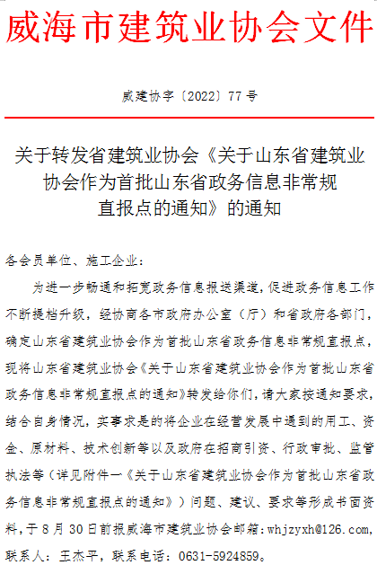 關(guān)于轉(zhuǎn)發(fā)省建筑業(yè)協(xié)會《關(guān)于山東省建筑業(yè)協(xié)會作為首批山東省政務信息非常規(guī)直報點的通知》的通知