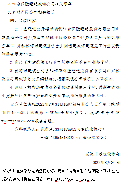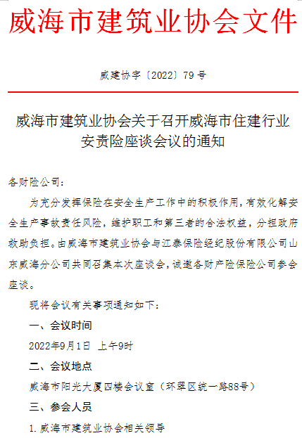 威海市建筑業(yè)協(xié)會關(guān)于召開威海市住建行業(yè)安責(zé)險(xiǎn)座談會議的通知