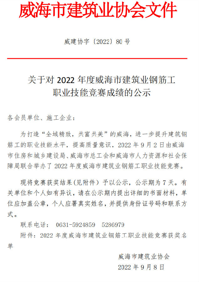 關于對2022年度威海市建筑業(yè)鋼筋工 職業(yè)技能競賽成績的公示