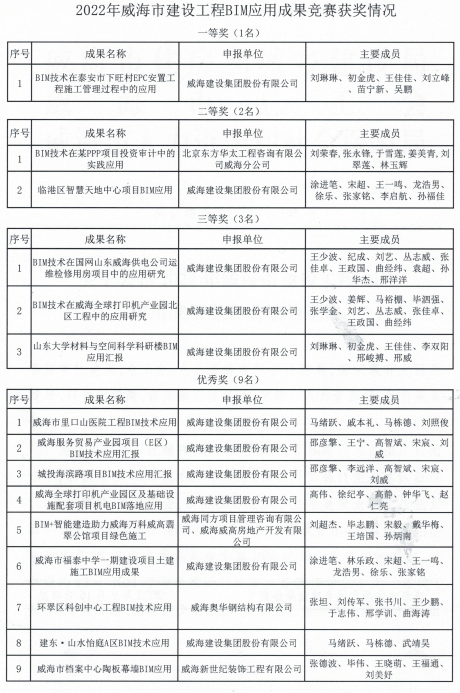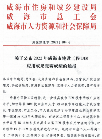 關(guān)于公布2022年威海市建設(shè)工程BIM應(yīng)用成果競賽成績的通報