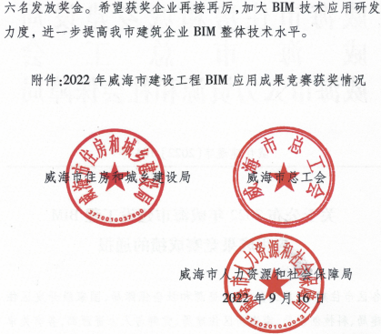 >關(guān)于公布2022年威海市建設(shè)工程BIM應(yīng)用成果競賽成績的通報