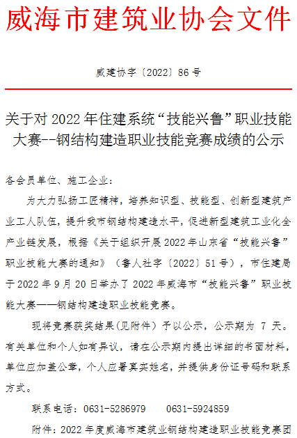 >威海市建筑業(yè)協(xié)會關(guān)于對2022年住建系統(tǒng)“技能興魯”職業(yè)技能大賽--鋼結(jié)構(gòu)建造職業(yè)技能競賽成績的公示