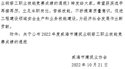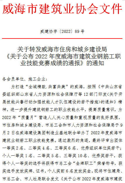 2022年89號(hào)關(guān)于轉(zhuǎn)發(fā)威海市住房和城鄉(xiāng)建設(shè)局《關(guān)于2022年度威海市建筑業(yè)鋼筋工職業(yè)技能競賽成績的通報(bào)》的通知