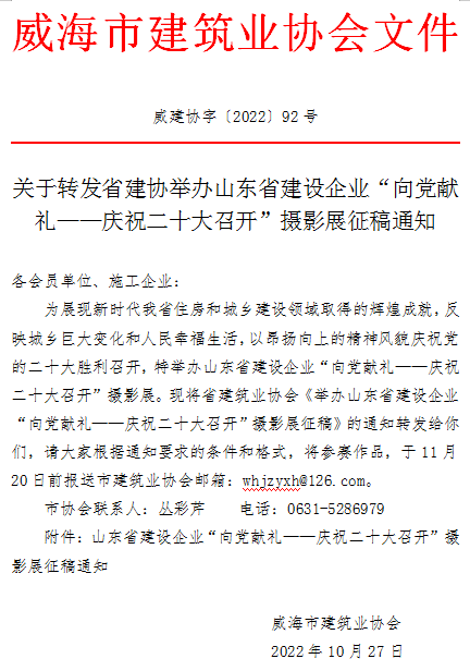 關(guān)于轉(zhuǎn)發(fā)省建協(xié)舉辦山東省建設(shè)企業(yè)“向黨獻(xiàn)禮——慶祝二十大召開”攝影展征稿通知