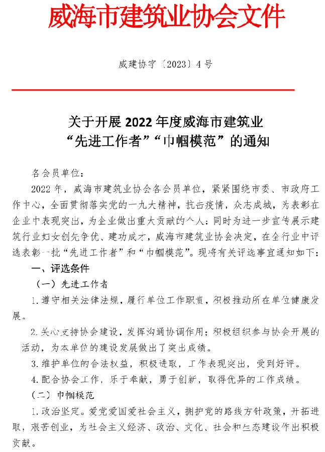 >關(guān)于開展2022年度威海市建筑業(yè) “先進(jìn)工作者”“巾幗模范”的通知