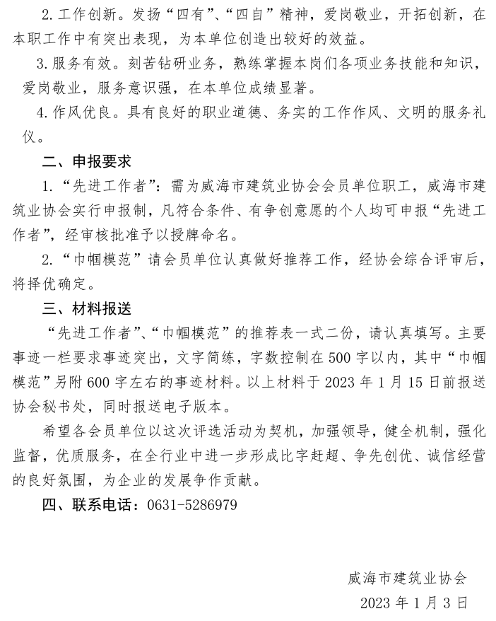 關(guān)于開展2022年度威海市建筑業(yè) “先進(jìn)工作者”“巾幗模范”的通知