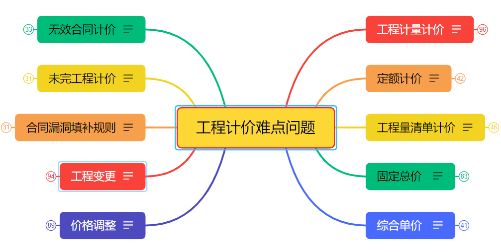 1.涉及工程計(jì)量、定額計(jì)價(jià)、清單計(jì)價(jià)、固定總價(jià)、綜合單價(jià)、價(jià)格調(diào)整、工程變更、未完工程計(jì)價(jià)、無效合同計(jì)價(jià)、計(jì)價(jià)約定不明時(shí)的漏洞填補(bǔ)等。