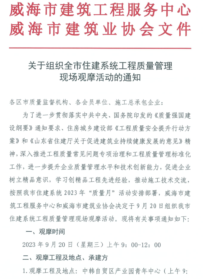 關于組織全市住建系統(tǒng)工程質量管理現(xiàn)場觀摩活動的通知