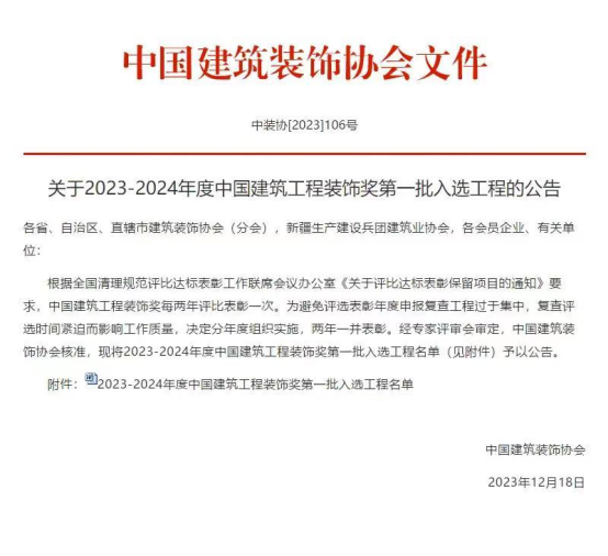近日,中國建筑裝飾協(xié)會(huì)發(fā)布《關(guān)于2023-2024年度中國建筑工程裝飾獎(jiǎng)第一批入選工程的公告》(中裝協(xié)〔2023〕106號(hào)),我市推薦申報(bào)的4項(xiàng)工程被授予“中國建筑工程裝飾獎(jiǎng)”,其中公共建筑裝飾類4項(xiàng),建筑幕墻類1項(xiàng)。