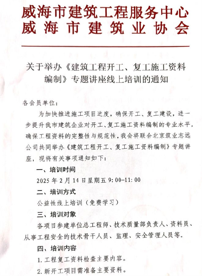 >關(guān)于舉辦《建筑工程開(kāi)工、復(fù)工施工資料編制》專(zhuān)題講座線上培訓(xùn)的通知