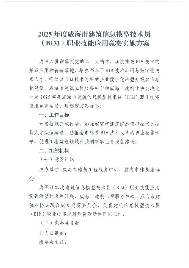 關(guān)于開展威海市建筑信息模型技術(shù)員(BIM)職業(yè)技能應(yīng)用競賽的通知