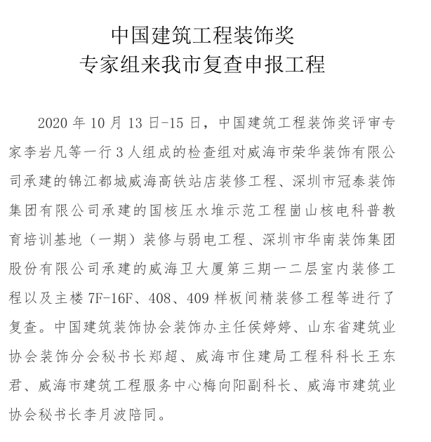 中國(guó)建筑工程裝飾獎(jiǎng)專(zhuān)家組來(lái)我市復(fù)查申報(bào)工程